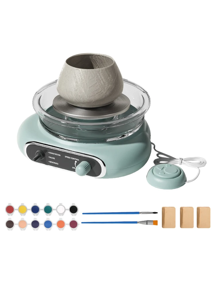 ✅【Comprehensive Pottery Starter Set】Our kids' pottery wheel kit comes with all the essentials. It includes a pottery wheel machine, power adapter, 2 painting brushes, 3 packs of air-dry clay, and 12 vivid paints. It's a fantastic starting point for beginners.