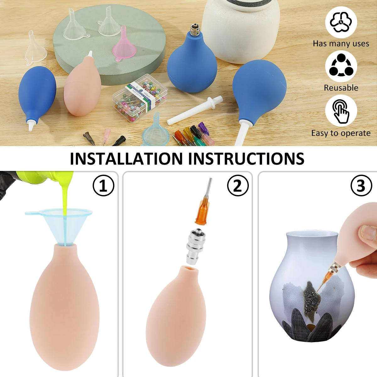 [Pottery Precision Applicator Set] The ceramic bottle glazing tool kit contains 2 x 3 oz squeeze balls, 2 x 1 oz squeeze balls, 8 different sizes of pins totaling 40 pins, 5 filling funnels, 1 metal connector, 1 box of unclogging pins