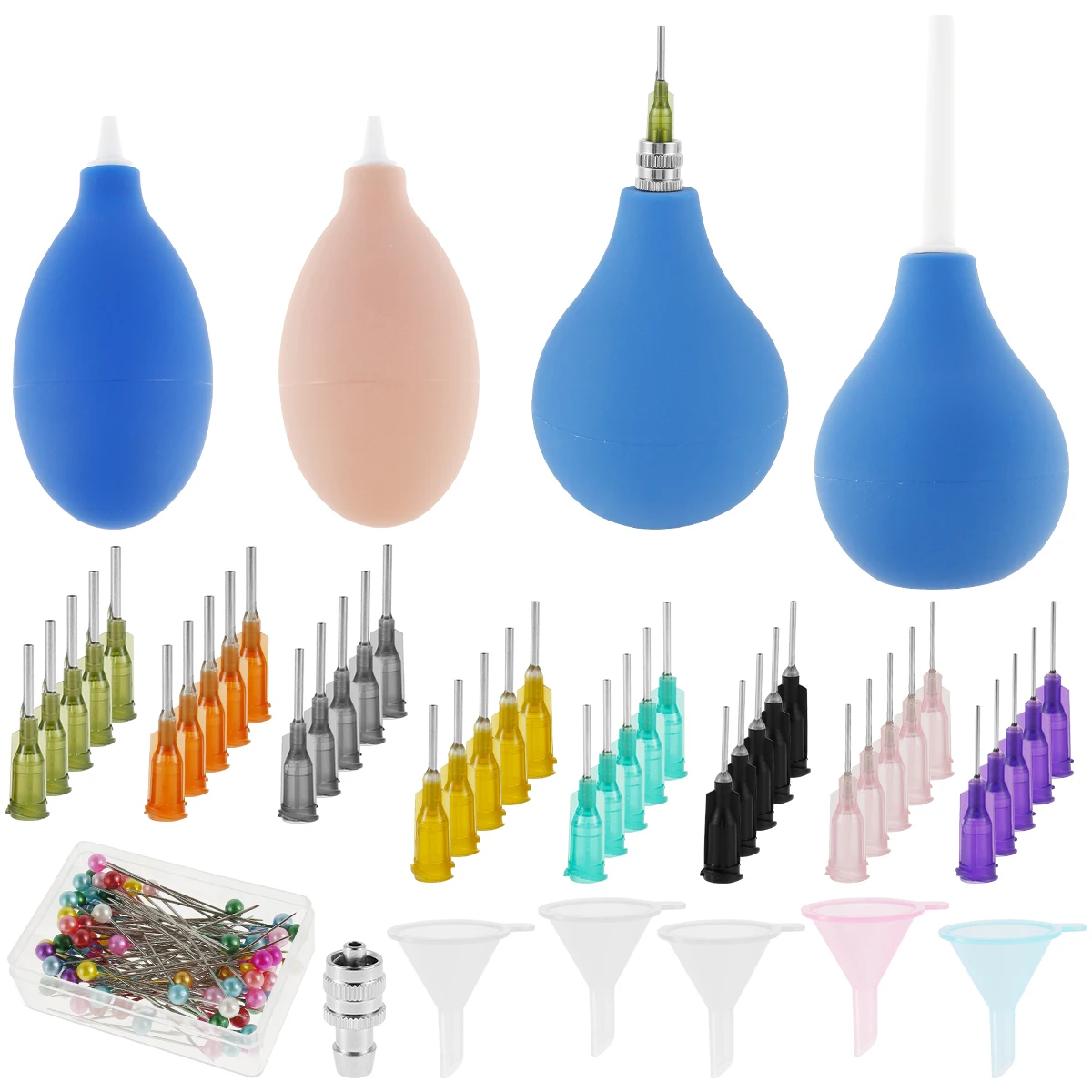 [With Funnel and Unclogging Needles] With 5 funnels for quick filling and 1 box of unclogging needles for cleaning the plastic steel needles, which can help reuse the needles.